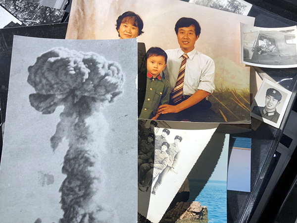 图左:70年代核武教材封面。图中:父母与作者全家福,摄于1988年。图中下:1979年防化团退伍纪念照。图右上:1976年核试时,父亲为侦察兵驾驶员,驾驶该北京吉普三次进入原子弹和氢弹爆心。图右下:父亲参军证件照。