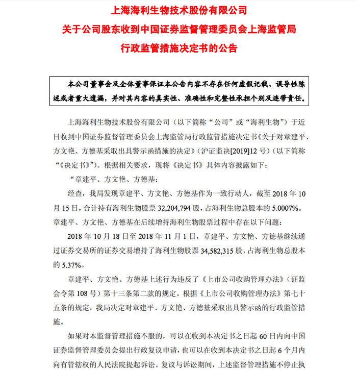 2月10日晚间,海利生物(603718)公告,公司股东收到证监会上海监管局行政监管措施决定书《关于对章建平、方文艳、方德基采取出具警示函措施的决定》(以下简称《决定书》),因增持违规,证监会上海监管局决定对公司股东章建平及其一致行动人方文艳、方德基采取出具警示函的行政监管措施。