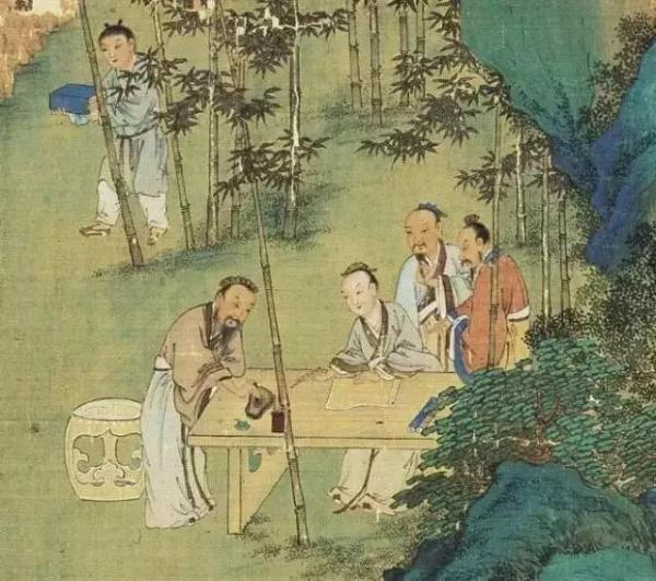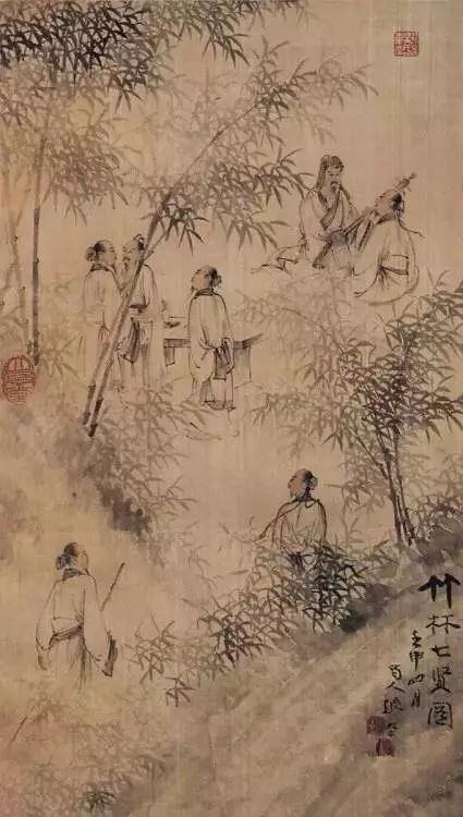 就具体的“七贤”来说也难以概而论之,有做官的,也有弃官的,但都不为礼法所束缚,表现出了强烈的个性。而“嗜酒能啸”大致也是他们的共同所好。最早将阮籍、嵇康、山涛、向秀、阮咸、王戎、刘伶这七人合称为“七贤”之名,是东晋孙盛的《魏氏春秋》,因为这七人曾一起在河内山阳(今河南修武)居住,有“林下之游”的美谈。据专家考证,时间大致在三国曹魏齐王曹芳的正始中期到正始十年(249 年)的那四五年间。尽管后人对“七贤”中的各位评价不一,但公认以嵇康未收几无歧义。可是,如果问嵇康,他可能不会同意。因为他写了《与山巨源绝交书》,“今但愿守陋巷,教养子孙,时与亲旧叙离阔,陈说平生,浊酒一杯,弹琴一曲,志愿毕矣。足下若嬲之不置,不过欲为官得人,以益时用耳。足下旧知吾潦倒粗疏,不切事情,自惟亦皆不如今日之贤能也。若以俗人皆喜荣华,独能离之,以此为快。”“若趣欲共登王途,期于相致,时为欢益,一旦迫之,必发狂疾。”“其意如此,既以解足下,并以为别。”嵇康所表明的“道不同不相为谋”,欣然是不愿意待在这同一个群里,否则,他真的“必发狂疾”。或许是限于当时的传播能力,最早在《魏氏春秋》中并称“七贤”的东晋人孙盛可能还没有看到嵇康的《与山巨源绝交书》,就将他们拉进了一个群里,它所依据的还是传说中的当年七人“林下之游”。而绘画中的“七贤”,早在顾恺之的《魏晋胜流画赞》论魏晋两代名画家卫协、戴逵等所作的21幅作品中就有“七贤”:“唯嵇生一像欲佳,其余虽不妙合,以比前诸竹林之画,莫能及者。”