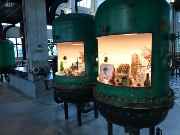 原先卷烟厂房里的大灯被用作摆放、陈列物品的容器