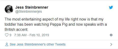 此后,美国家长们纷纷在社交媒体上分享自家孩子们在语言方面的突然变化。杰斯·斯泰因布里纳称:“我现在生活中最有趣的事情就是,我蹒跚学步的孩子一直在看《小猪佩奇》,现在他说话带着英国口音。”
