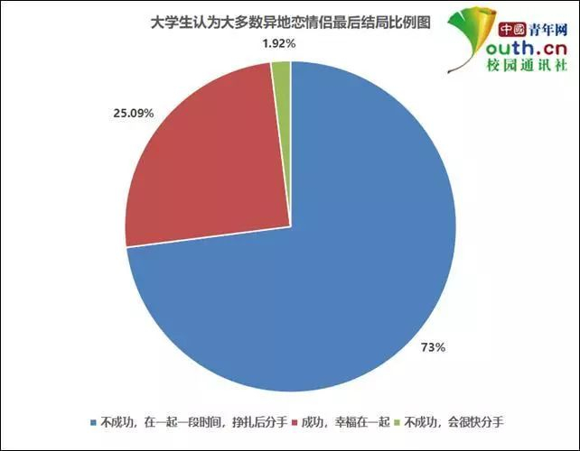 虽然大多数人能够接受异地恋,但是对于异地恋的结局却少有人看好。在调查中,25.09%的大学生认为异地恋的人会成功幸福地生活在一起;73%的大学生则认为不成功,在一起一段时间,挣扎后分手;1.92%则认为会很快分手。