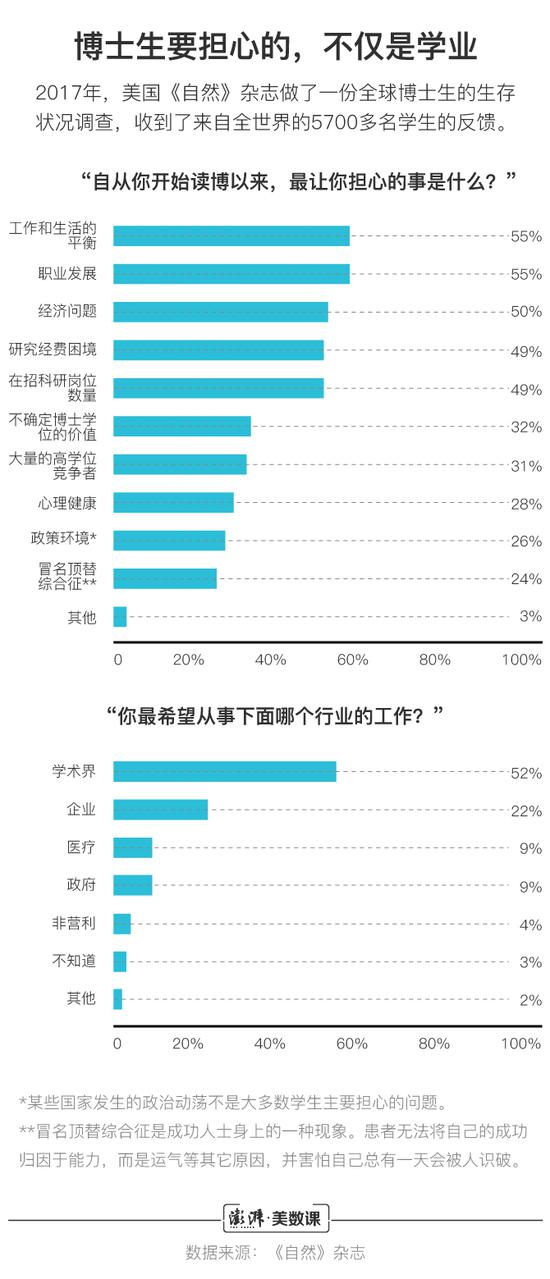 美国《自然》杂志曾在2017年做过一份全球博士生的生存状况调查。报告显示,“经济问题”是博士生第三担忧的问题。稳居第一的,是“工作和生活的平衡”。不过,尽管博士生们害怕生活被科研占据,但大多数人还是愿意继续从事科研工作。