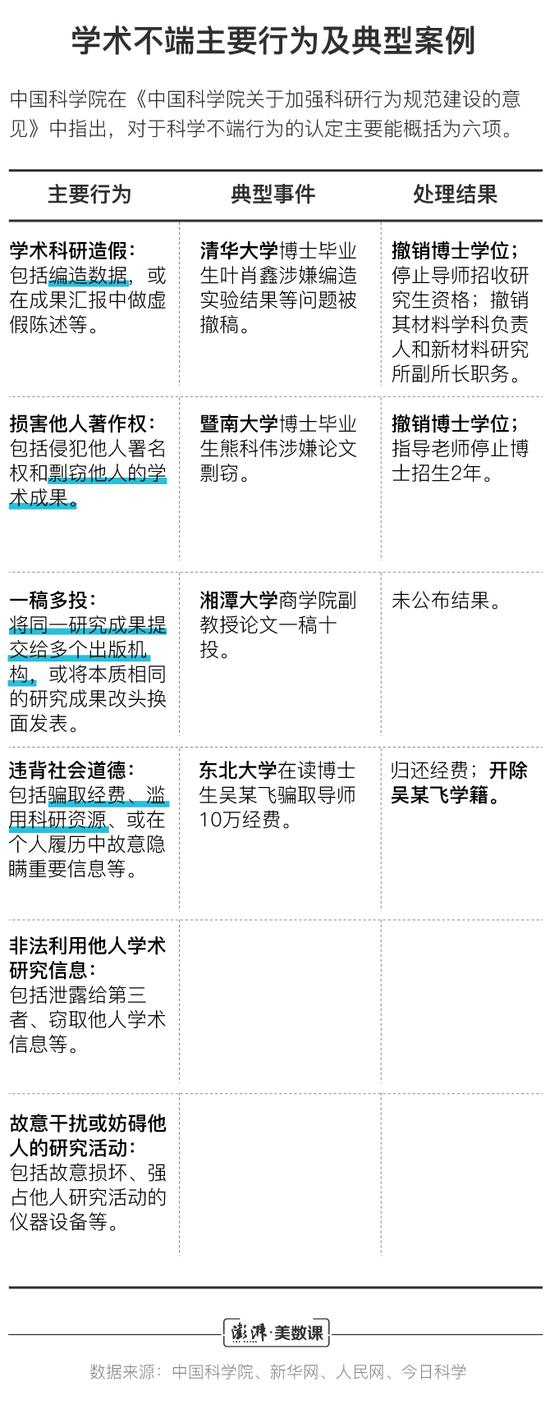 澎湃新闻(www.thepaper.cn)通过梳理科学不端行为的典型案例发现,涉及第一类“在研究和学术领域内有意做出做出虚假的陈述”是比较常见的“涉学术不端行为”,主要包括编造数据;篡改数据等。此前清华大学博士生叶肖鑫涉学术不端被撤稿,是近年来这类问题中一起较为典型的案例。