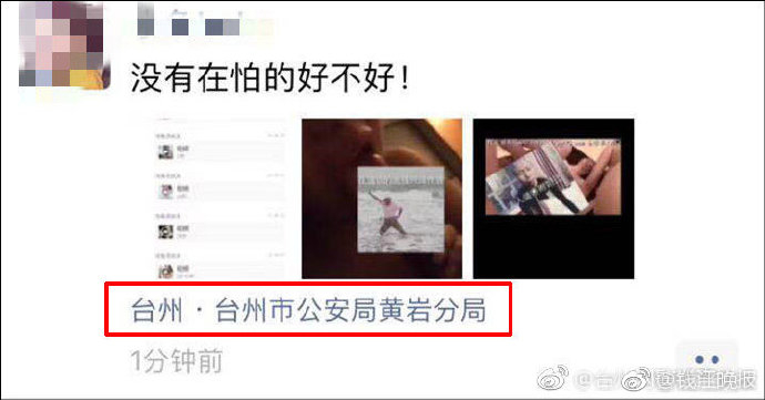 据台州网警巡查执法 官方微博消息,近日,有人在微信朋友圈公然售卖色情视频,称没什么怕的,并将自己定位在浙江省台州市公安局黄岩分局,公然挑衅警方。