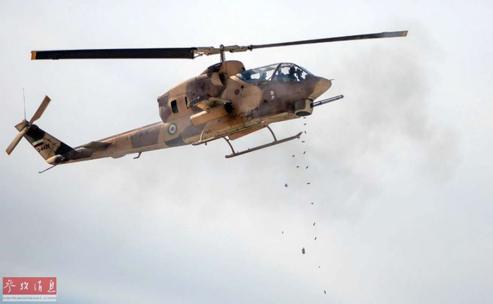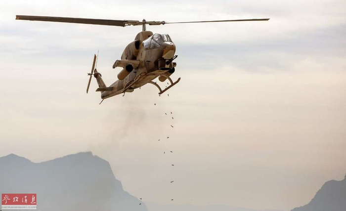 近日,网上又放出一组伊朗陆航部队AH-1J攻击直升机进行实弹打靶的图片,图为AH-1J使用三管20毫米M197速射炮对地扫射,可见抛出的弹壳。