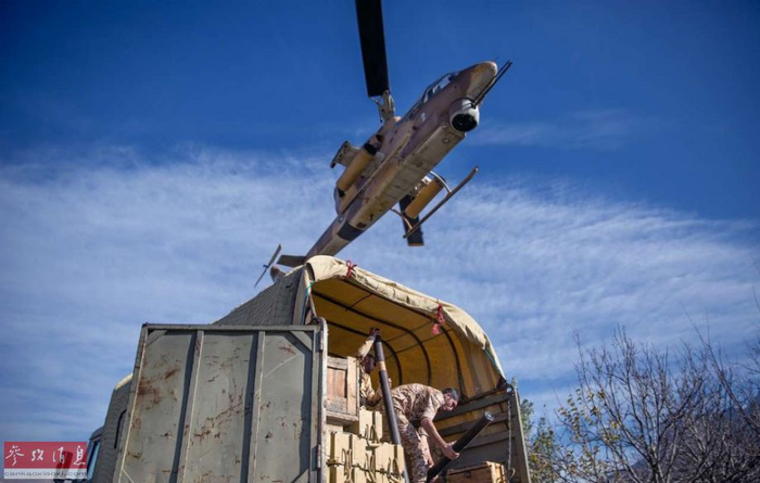 参演的伊朗陆军贝尔-212“双发版”休伊运输直升机,还加装了转管速射机枪和火箭巢。