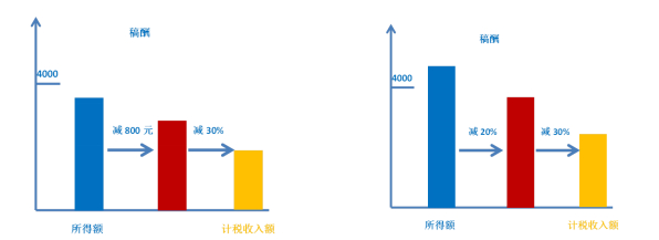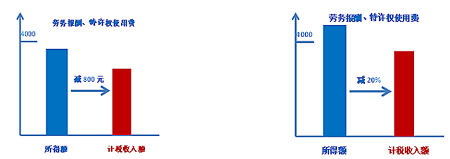 劳务报酬所得、特许权使用费所得每次收入不超过四千元的,减除费用按八百元计算;每次收入四千元以上的,减除费用按百分之二十计算。