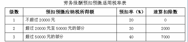 劳务报酬所得适用百分之二十至百分之四十的超额累进预扣率。稿酬所得、特许权使用费所得适用百分之二十的比例预扣率。