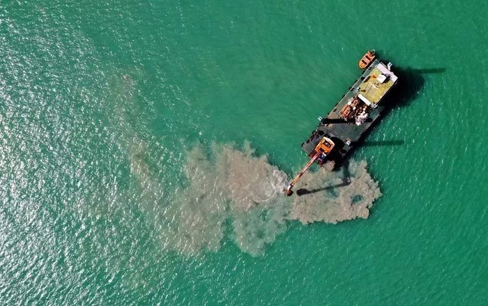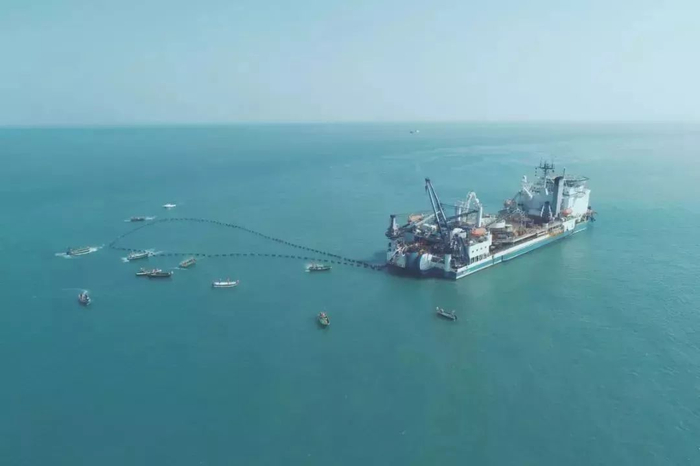 后期再从海面上把石块精准地抛到海底筑成梯形石坝,好比给海底电缆穿“防护衣”、披“铠甲”,对海底电缆进行全方位保护。