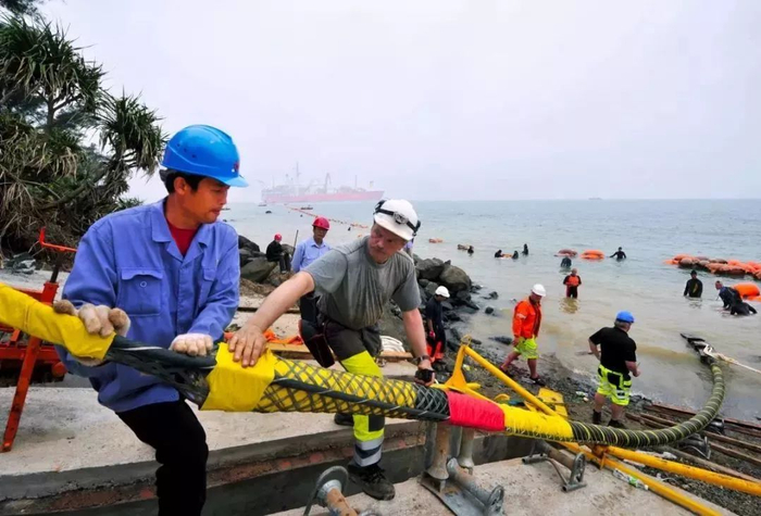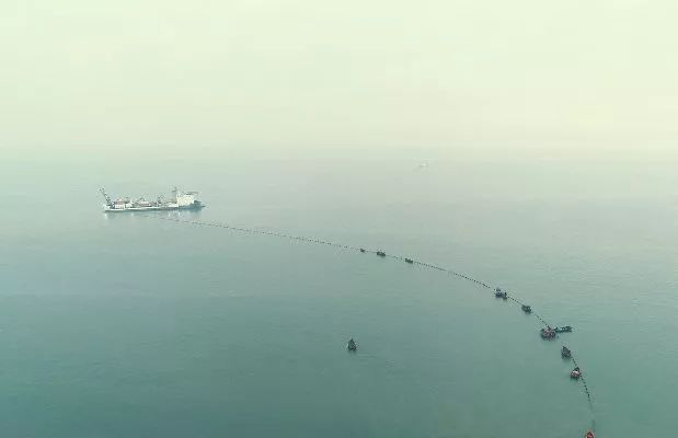 海缆登陆段的敷设作业敷设船停在距岸边1公里左右的地方,将绑扎好浮体的海缆从船尾“吐”出。