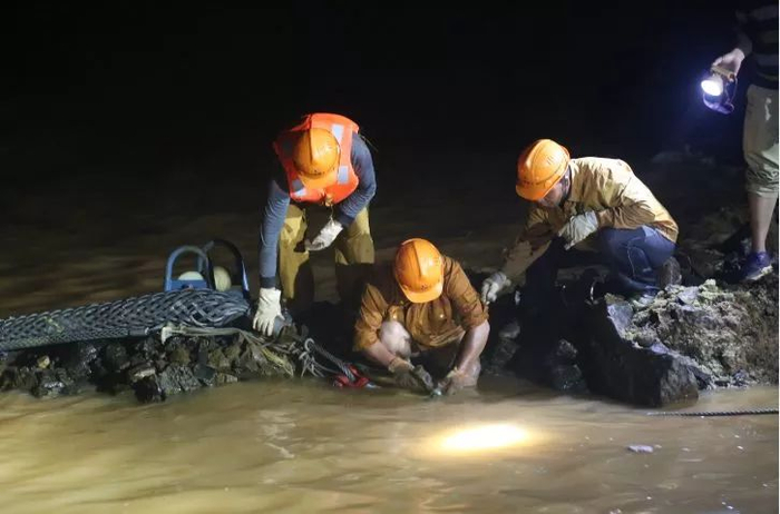 海底电缆在海南澄迈登陆,电力施工人员通宵作业。(宋印官摄)