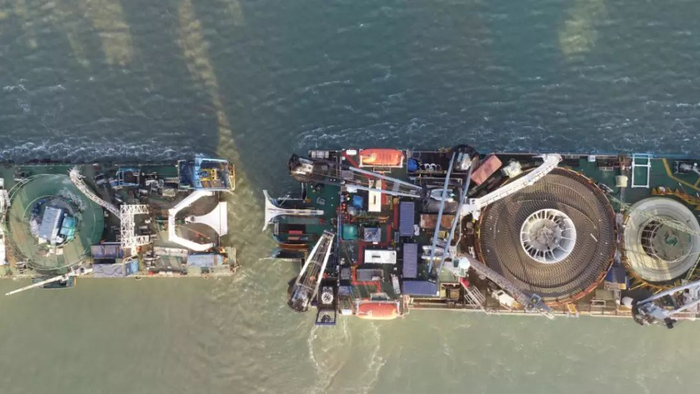 海缆敷设施工船满载海底电缆,抵达距离南岭终端站5.5公里左右的指定敷设海域。海缆敷设施工船与另一艘辅助施工船对接,开始倒缆,将部分电缆转移到辅助施工船上。