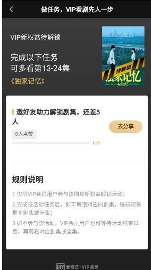 市民杨小姐介绍,不久前,她为了观看某热播影视剧,开通了爱奇艺连续月包会员。没想看到第13集时,需要好友点赞助力才能继续观看。对于这种集赞活动,她表示匪夷所思,“买了会员还要拉人头才才能继续看片,简直是各种套路,商家的行为太流氓了。”市民周小姐则称,她因此干脆弃剧。