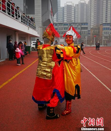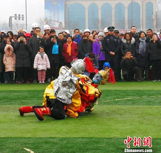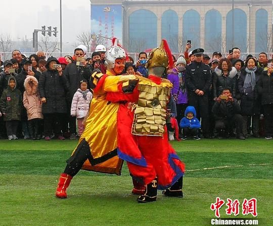 中新网太原2月18日电 题:(新春见闻)中国传统社火表演“二鬼摔跤”受热捧