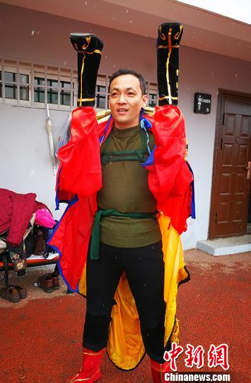 刘斌告诉中新网记者,这项非遗项目由于表演强度大,要求表演者有强健的体魄,具备一定的表演能力,以及舞蹈、杂技、哑剧、木偶剧等表演功底和技巧,表演难度非常大,所以表演者一般为男性,很少有女性参与。