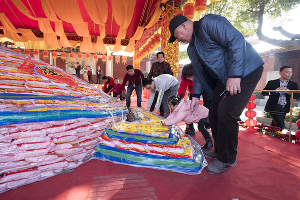 大年初一开始,人们纷纷前往天后宫“乞龟”。围着53800斤大米垒成的巨型“米龟”摸一圈,沾沾喜气的同时也为家人祈福。元宵节后,这些大米将分发给有需要的群众