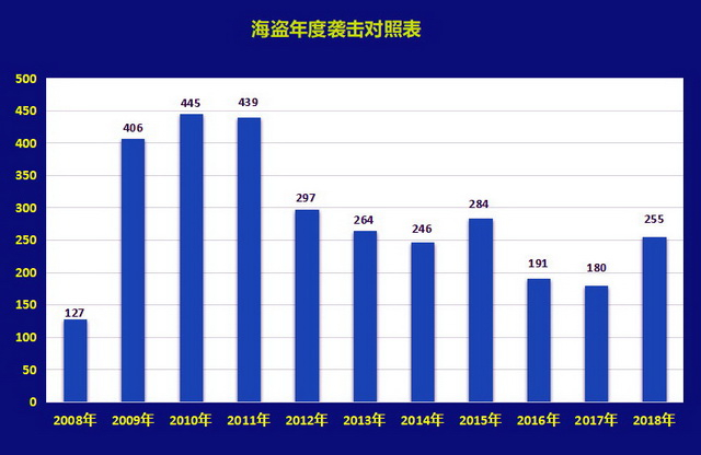 国际海事局海盗报告中心公布的2018年海盗袭击事件的数量比华信中安的要少,为201起,但与2017年的180起相比仍有明显增加,表明全球海盗活动有增无减。