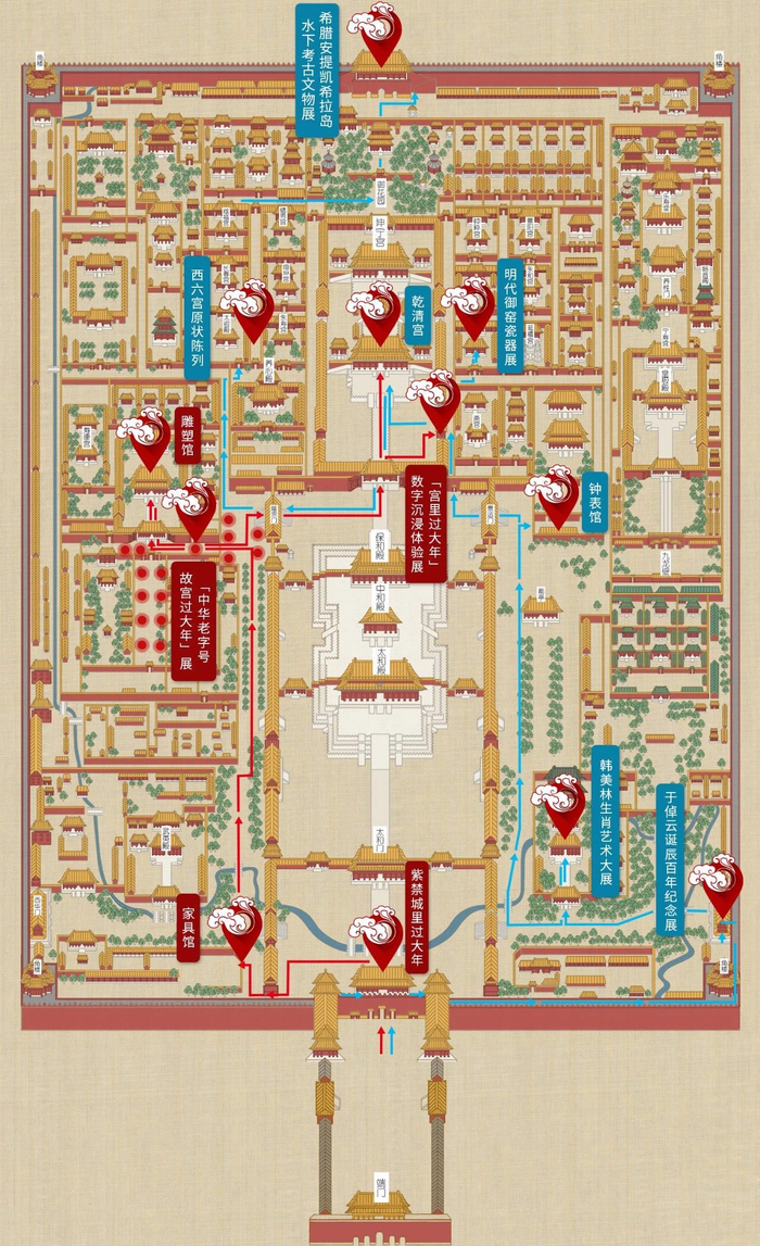 其中,“紫禁城里过大年”展览分为文物展览和实景体验两部分,文物展览位于午门正殿和东西雁翅楼展厅,实景体验部分包括整个故宫开放区域,在宫殿门口悬挂着寓意吉祥的春联、门神,在廊庑下装饰着华美的宫灯等,其中天灯、万寿灯的复原成为室外展场广受瞩目的景观。