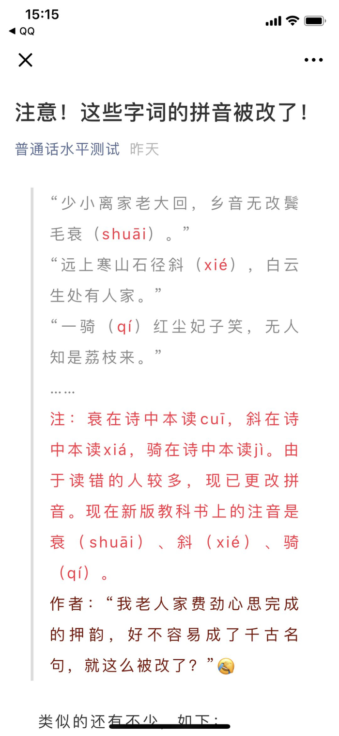 “平仄平仄平平仄,仄平仄平仄仄平”。我们还没从春晚小品的洗脑中释放出来,改字音这件事就让古诗一下子失去了韵律感。“少小离家老大回,乡音无改鬓毛衰(shuāi)”“远上寒山石径斜(xié),白云生处有人家”······字音一改,不符合韵脚,古诗也就不美。词可达意,音亦可传美。古诗词的美,不仅在于词句本身描绘的意境,也包含着朗读时产生的铿锵和谐感。