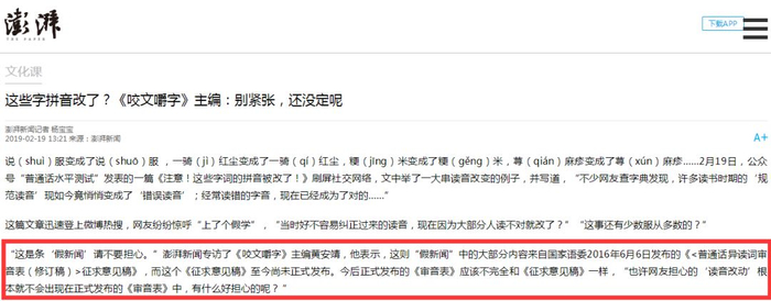 但若细细核实,便可发现热文并不是昨儿写成的!去年5月,《“说(shuō)客”“坐骑(qí)”你读对了吗?专家呼吁:汉字拼音不能随波逐流丢失表意魅力》,刊发在《北京晚报》上。这两天引发热议的文章,不过是炒了冷饭而已,不少字句表述还一模一样。