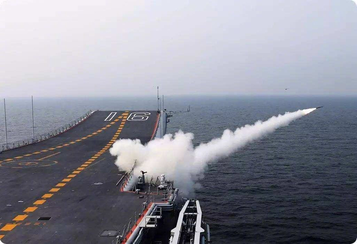 “辽宁”号航母上配备的“红旗”-10导弹发射瞬间。 中国军网 图