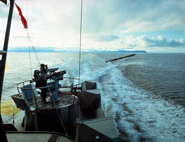 “辛巴达”-RC双联装遥控发射装置发射一枚“西北风”近程防空导弹,击中了快速航行的无人艇。