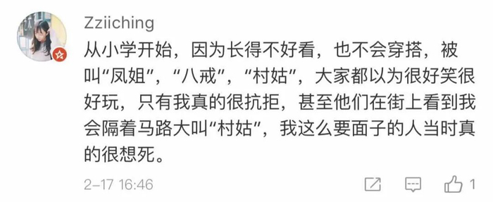 心疼那些因为身体被二次伤害的…👇@关于vincent的二三事:疤子婆 因为小时候出车祸 嘴角上留下了疤@愿您成佛:脸有段时间出油很严重,班上男生喊我偷油婆@SJ姣儿:高中胖,胸大,被一个好看当时关系不错但现在想想只有a的姑娘一直叫奶妈。我那时候好脾气好好和她说别这么说,但没用。现在好想削她……@宥是一只七:脸上痣多 但也不是满脸都是 叫我麻子@DDANQ麦子弹:凸额头怪物,就因为这样到现在都很没自信撩起刘海,很害怕别人看我额头,是真的心里害怕被人看到之后会被嫌弃@今天想吃干煸鸡:当年胸部发育的比其他同学早,所以经常含胸,导致头可能会前倾,班里男生就喊我老鳖,真的是心里阴影吧。