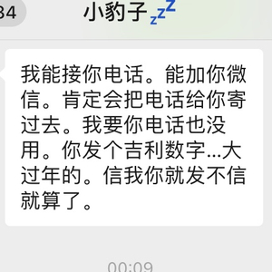 但过了一会,“小豹子”又将168元红包退给了小谢,并告诉小谢:“我能接你电话,能加你微信,肯定会把电话给你寄过去。我要你电话也没用。你发个吉利数字…大过年的。信我你就发不信就算了。”