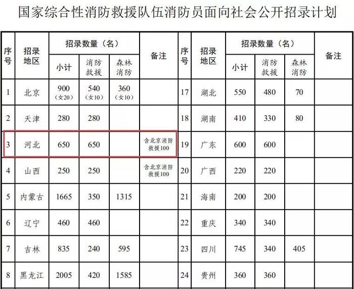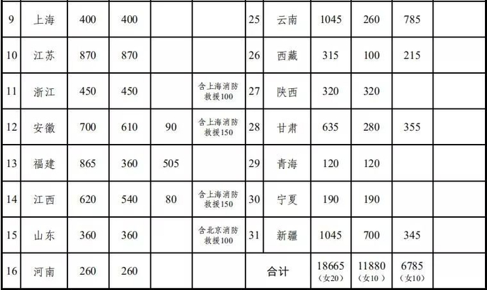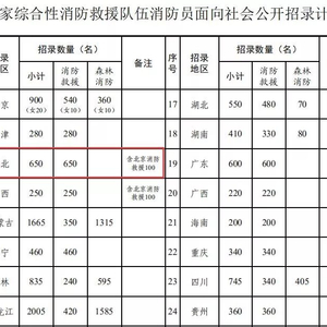 经应急管理部、人力资源社会保障部批准,此次国家综合性消防救援队伍面向社会公开招录消防员18665名,其中:消防救援队伍招录11880名,森林消防队伍招录6785名。各省(自治区、直辖市)招录计划见下表。