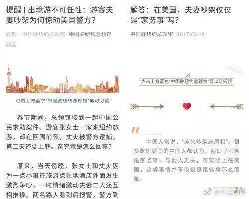 领馆工作人员提醒,夫妻打架在美国绝不是小事。夫妻或恋人闹别扭,在大街上拉拉扯扯,就好像国内电视剧中常见情节,旁人也不太理会。但这种情况如发生在美国,就很可能会有路人报警,甚至充当证人。