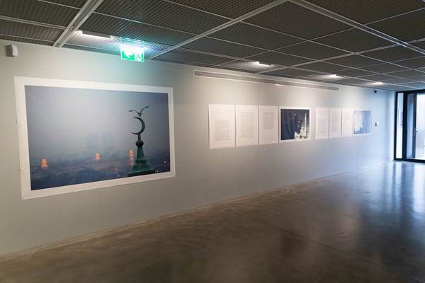 此次展览正是以帕慕克的摄影集《阳台》为基础,书页被放大,挂在上层展厅的墙上。下层地板上则布满了大尺寸的印刷照片,它们被放置在具有画布肌理的纸张上,但是没有画框装饰。在不少照片中,帕慕克公寓外一座19世纪清真寺的石质尖塔为作品提供了一个自然的边框。