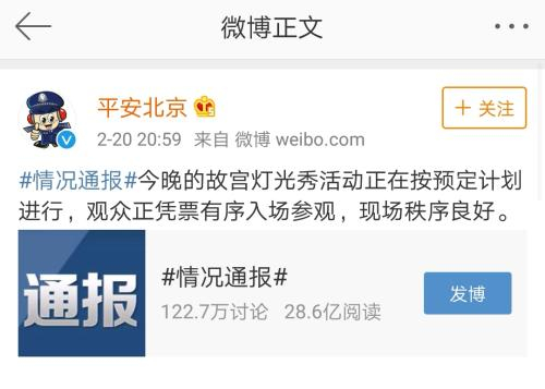 平安北京微博也及时进行情况通报,称:“今晚的故宫灯光秀活动正在按预定计划进行,观众正凭票有序入场参观,现场秩序良好。”
