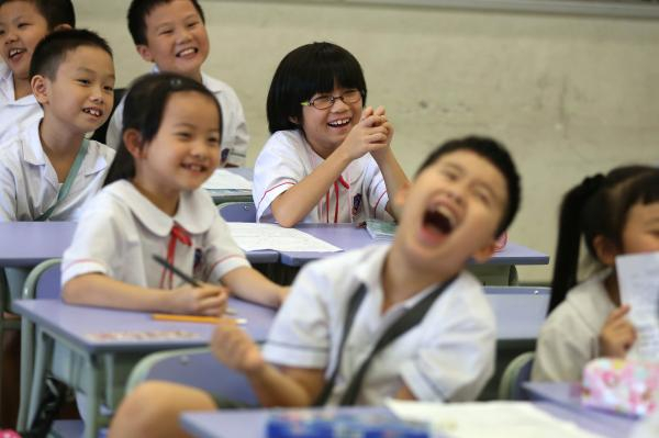 2013年6月27日,香港,上水惠州公立学校的中文课上,几个同学在陈述给同学们送礼物的理由,坐在下面的同学大笑。视觉中国 资料图