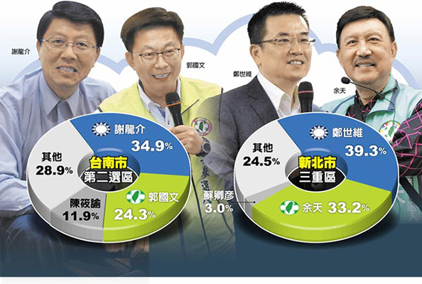 在台南市部分,谢龙介本人知名度高,加上“韩流”加持,根据旺旺中时媒体集团最新民调显示,谢龙介以34.9%支持度胜过民进党候选人郭国文的24.3%,民进党脱党参选的陈筱谕则有11.9%,显然绿营分裂也是导致郭国文陷入险境的原因。新北三重原也是“绿军铁票仓”,且民进党候选人余天曾在三重当选过“立委”,本人知名度也高,但据民调显示,郑世维在韩国瑜帮忙造势后,民调开始往上升,现以39.3%领先余天的33.2%。