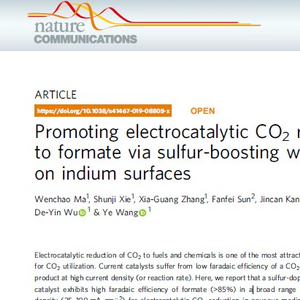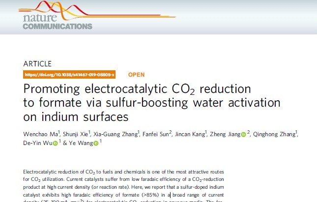 化学化工学院王野课题组与吴德印课题组合作,在二氧化碳电催化还原制甲酸的研究上取得重要突破,相关成果“Promoting electrocatalytic CO2 reduction to formate via sulfur-boosting water activation on indium surfaces”发表于Nature Communications(Nat. Commun. 2019, DOI: 10.1038/s41467-019-08805-x)。