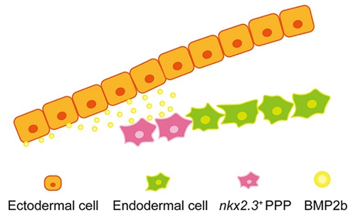 图4:咽区外胚层表达并分泌BMP2b蛋白,促进邻近内胚层细胞特化为咽囊前体细胞的模式图。