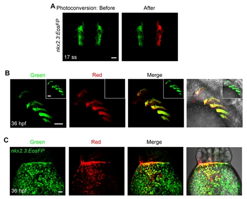 研究人员首先构建了咽囊特异表达红色荧光的转基因斑马鱼Tg(nkx2.3:mCherry),惊奇地发现早在10体节期的胚胎中即有mCherry表达。通过活体胚胎动态观察,这些nkx2.3-mCherry+的细胞最初与心肌前体细胞混杂在一起,位于胚胎咽部两侧。在随后的发育过程中,部分nkx2.3-mCherry+细胞向心脏区域迁移,并参与了心包膜(pericardium)的形成;其他nkx2.3-mCherry+细胞滞留在咽区,经过迁移、增殖和分化,形成了数个咽囊。随后,通过nkx2.3-EosFP转基因鱼的细胞谱系追踪实验表明,大部分咽囊细胞来源于上述这些nkx2.3-mCherry+细胞(图3),而且通过NTR-MTZ系统诱导nkx2.3-mCherry+细胞凋亡会导致咽囊缺失。表明nkx2.3-mCherry+细胞是咽囊前体细胞更为直接的证据来自于Tg(nkx2.3-mCherry;sox17-GFP)双转基因鱼胚胎。在这种胚胎中观测到了绿色的内胚层细胞转变为红色的咽囊前体细胞的动态过程,说明咽囊前体细胞由位于边缘位置的咽区内胚层细胞分化而来。