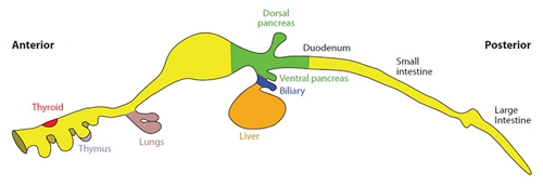 图2:原始肠道与内胚层器官的形成(引自Aaron et al., 2009)