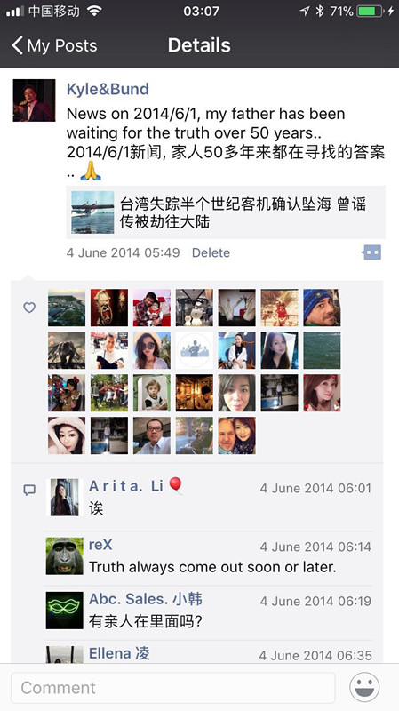 “大伯找到了,飞机掉海里了。”2015年春节,孙国维回台北看望他父亲,拿出手机上的报道给他父亲看。他父亲看完,终于平淡地说了一句:“哦”。