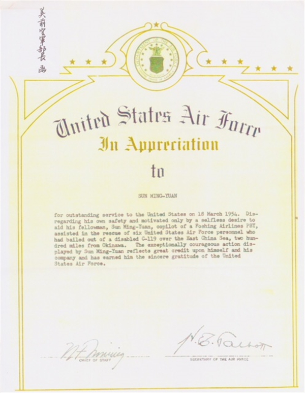 期间最著名的一次任务,就是陈文宽和孙明远驾驶老旧的美制PBY“蓝天鹅”水上飞机救出七名美军顾问的事情,堪称当时飞机海上搜救的经典案例。1955年3月18日上午,一架美军C119飞机在从美军关岛基地飞往台北松山基地的航程中,飞机引擎发生故障,机上七名美军被迫跳伞落于太平洋中。事发后,美军派出两架HU16“信天翁”水上飞机前往搜救,在发现遇难者后,但由于海面风浪过大无法降落,随即向台湾国民党当局求助。台湾当局派出经验丰富的陈文宽、孙明远机组驾驶老旧的PBY“蓝天鹅”水上飞机前往施救,在浪高风急的海面,于当日傍晚以高超的技术和无畏精神,救出落水幸存的六名美军。为此,美国军方为孙明远颁发了嘉奖令称:“对孙明远先生非凡的勇气予以表扬”。