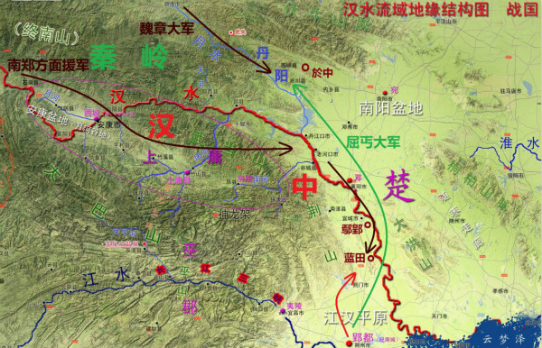 魏章沿汉水而下,攻占了楚国故都鄢郢(今湖北宜城市东南)。楚国则在蓝田(今湖北钟祥市西北)集结大军,准备与秦军决战。当时有两个蓝田,一个是秦国蓝田(今陕西蓝田县西),距秦都咸阳很近;另一个是楚国蓝田(今湖北钟祥市西北),位于鄢郢之南。太史公似乎不知道楚国也有一个蓝田,所以在《史记·屈原列传》中写道:“怀王乃悉发国中兵以深入击秦,战于蓝田。”误以为这场战争发生在秦国蓝田。楚国在丹阳之战损失惨重,能在短时间内重新召集军队组织有效的抵抗已经很不容易了,让楚军深入秦境数百里,其中还要翻越秦岭,可能性微乎其微;纵然楚军能杀到秦国蓝田,后勤补给恐怕也跟不上。而南下的秦军在后勤保障上则有一个天然的优势——汉水,所有军需物资都可以沿着汉水及其支流而下,源源不断地供给前线。