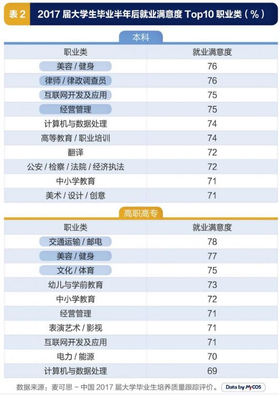 从职业角度来看,从事“美容/健身”和“律师/律政调查员”职业类的2017届本科毕业生就业满意度最高,均为76%。其次为互联网开发及应用和经营管理,满意度均为75%。