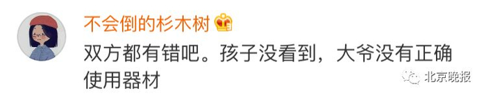 有网友认为是孩子自己不小心: 有人认为大爷没有正确使用健身器材: 有人说双方都有责任: 有网友认为是家长没有监护好: 还有人觉得园方应该负责: 北京允安律师事务所齐正律师表示,孩子是未成年人,作为监护人,有义务保护他们的安全;公园作为管理方,也同样有义务保障游客安全,比如,对剧烈运动的老人进行提醒等。齐律师表示,责任划分还要具体看案件细节,总体来讲,锻炼身体的这位老人责任比重是最大的。