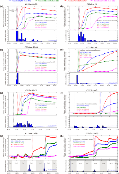 图4 人工植树造林和植被自然恢复小流域不同地形(坡面和沟谷)条件下高精度降雨-土壤水分响应分析