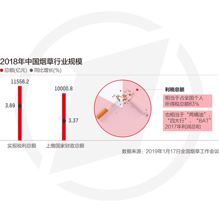 2019年1月17日,在全国烟草工作会议上,国家烟草专卖局党组书记、局长,中国烟草总公司(下称“中烟总公司”)总经理张建民说,2018年,全国烟草行业实现税利总额11556.2亿元,同比增长3.69%;上缴国家财政总额10000.8亿元,同比增长3.37%。比较而言,烟草行业2018年的利税总额相当于当年全国个人所得税总额的83%,亦相当于“两桶油”、“四大行”、“BAT”2017年的利润总和。