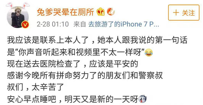 凌晨,洛阳警方通过实地寻找,发现女子几天前独自来到武汉,@兔爹哭晕在厕所 得知消息后,因自己身在国外不知如何联系,就找到自己国内一位朋友向武汉警方打电话报警求助。