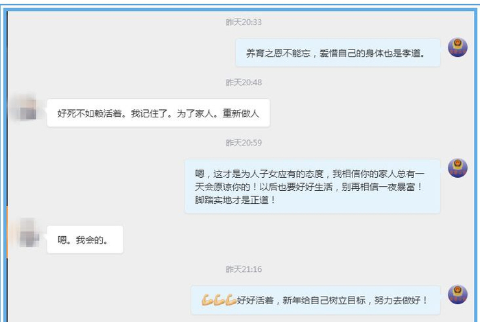 经过两地公安劝解,冷静下来的小H表示不会再有轻生的想法,并向@芙蓉公安回复私信,表示为了家人会好好活下去。