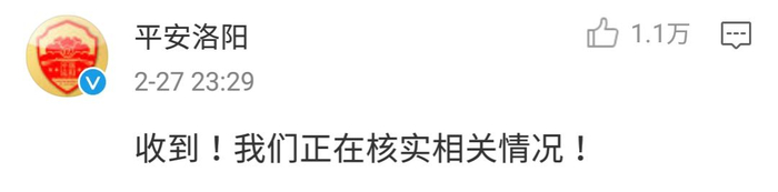 23时29分,洛阳警方表示接到报警,迅速在微博上与博主沟通,同时马上投入警力线下查找。