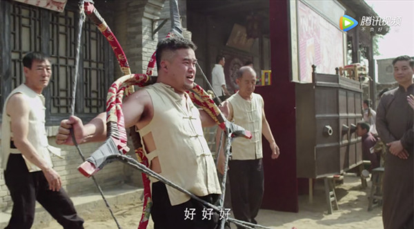 同一集中还有一组类似的镜头,街道上人群熙攘,拉洋片的,顶缸的,拉弓的,吞剑的,天桥绝活儿随着镜头如老北京风情画般展开,最后停在摔跤的几人这里,正是严振声父兄等人。